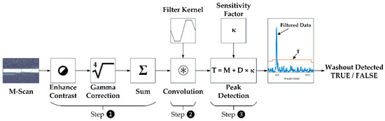 Figure 3). First, the algorithm performs an intensity scaling and gamma correction for contrast enhancement and sums up the intensity values of each A-scan within the M-scan. Second, the data are convolved with a dedicated filter kernel to create a peak response to possible fringe washouts. Third, a dynamic threshold that adapts to noise and intensity differences is applied to the processed M-scans to identify fringe washouts based on the peak response from step two. According to the equation depicted in step No. 3. in