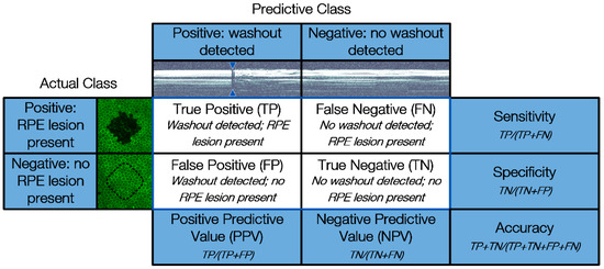 Figure 4 features four cardinalities: true positive (TP), true negative (TN), false positive (FP) and false negative (FN). Positive and negative refer to the prediction made by SD-OCT M-scans of whether an RPE lesion was created, based on the presence of fringe washouts, while true and false evaluate the correctness of this statement.