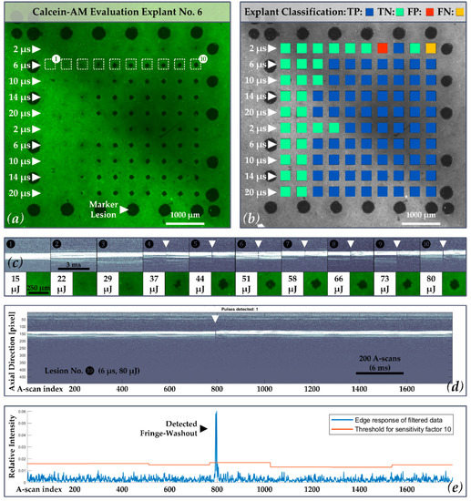37]. This criterion leads to fine fringe washouts being discarded by the algorithm, which results in a low number of falsely identified events (overall FP = 24). Since the algorithm focuses on detecting large RPE lesions, many small lesions were missed, leading to a higher number of missed events (overall FN = 93). The overall moderate sensitivity of 85% and high specificity of 93% of the algorithmic evaluation can therefore be attributed to the assumption made during the algorithm development. Therefore, the dosing algorithm for fringe washouts in SD-OCT M-scans should be compared again to RPE damage using a calcein-AM viability assay and an area-based detection criterion (i.e., at least 50% dead RPE cells). Furthermore, the lesions should be applied with a laser burst or ramp application, as currently advocated for SRT [