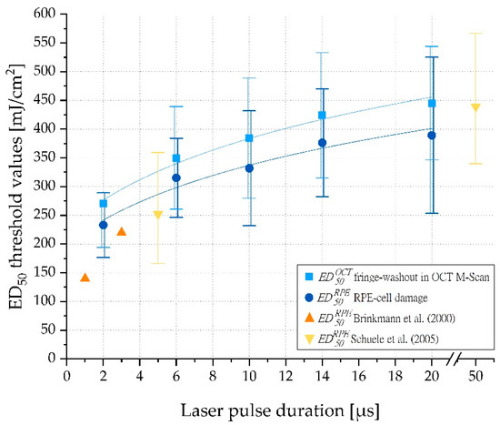 39], we confirmed that RPE radiant exposure damage thresholds increase with increasing pulse duration (