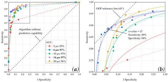 κ-value by checking the optimal operating point (OOP) for each pulse duration. Furthermore, we calculated the area under the ROC curve (AUC) in order to determine for which pulse duration, the dosimetry algorithm showed the best overall performance.