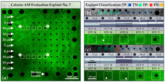 Figure 2a, the outer rim of the laser test pattern contained 25 LPC marker lesions. These marker lesions were applied in CW mode (200 ms pulse duration and 200 mW pulse power). The marker lesions served as an orientation guide in the evaluation process of the RPE explant. The microsecond laser probe region was placed inside the demarcation frame consisting of a pattern of 10 × 10 lesions. Laser pulses with durations of 2, 6, 10, 14 and 20 µs with increasing energy were applied. The exact radiant exposure values for each lesion can be found in