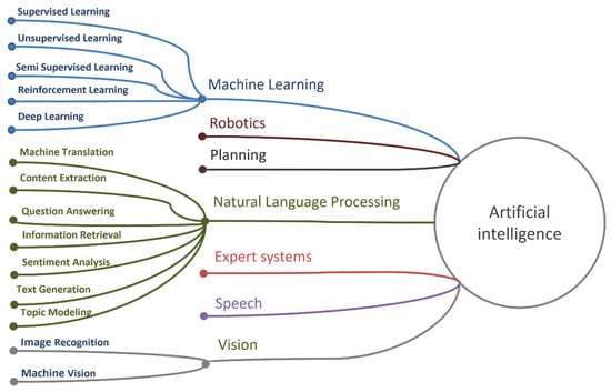 Artificial intelligence (AI) is the ability of a digital computer or computer-controlled robot to perform tasks commonly associated with intelligent beings [18]. In other words, AI is any software and hardware method that mimics human behavior and thinking. AI includes machine learning, natural language processing (NLP), text and speech synthesis, computer vision, robotics, planning, and expert systems [19]. A schematic representation of the components of AI is shown in Figure 1.