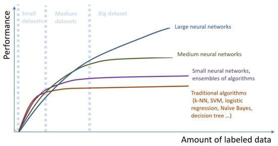 The advantage of deep neural networks is evident when processing large amounts of data. The quality of traditional algorithms, reaching a certain limit, no longer increases with the amount of available data. At the same time, deep neural networks can extract the features that provide the solution to the problem, so that the more data, the more subtle dependencies can be used by the neural network to improve the quality of the solution (Figure 3 [61]).