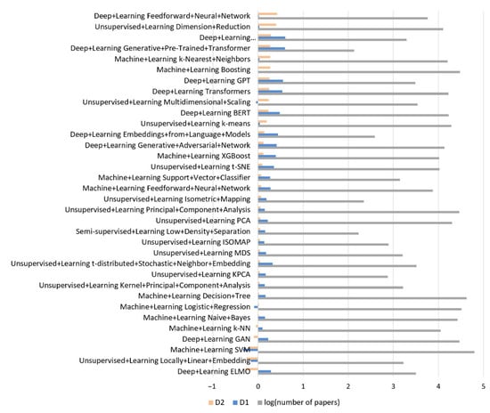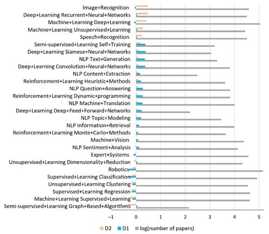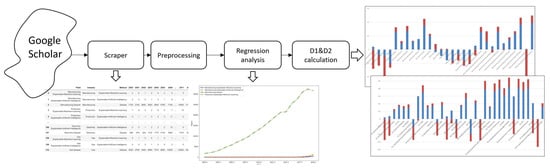 In this regard, it would be interesting to consider how the interest of researchers has changed over time and, if possible, to identify those areas of research that are currently receiving increased attention and to focus on them. At the same time, the number of publications in many areas of AI is growing. Therefore, a simple statement of the increase in the number of publications is not enough. In this connection, bibliometric indicators (BI), such as the number of publications, the citation index, the number of co-authors, etc., are widely used to assess the productivity of scientists [4,5]. BI has also been applied to the evaluation of universities [6] and research domains [7]. BI is used for the assessment of policy making in the field of scientific research [8] and the impact of publication databases [9]. The authors of [10] use bibliometric data to build prediction models based on bibliometric indicators and models of system dynamics. In papers [11,12], the mentioned approach is combined with patent analysis. The prediction task is important in the situation of quick technological changes. To do this, the changes in the Hirsch index in time are examined [13] and the concept of a dynamic Hirsch index is suggested [14].