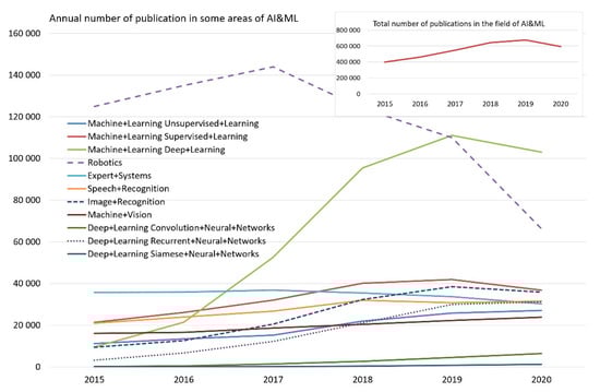 In addition to the systematization of AI&ML sections, their evolution is also of interest. Let us assess the dynamics of changes in the number of scientific publications aimed at the development of individual scientific domains and overcoming the aforementioned technological limitations of AI&ML.