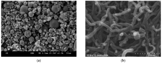In this study, OPC and FA were used as binders to fabricate CNT-reinforced cement composites. Table 1 shows the chemical compositions of OPC and FA by X-ray fluorescence (XRF) analysis (ZSX Primus II, Rigaku, Tokyo, Japan). The densities of OPC and FA were 3.14 and 2.30 g/cm3, respectively. For FA, the refined FA produced at thermal power plant Y in South Korea was used. The contents of CaO and SiO2 + Al2O3 + Fe2O3 in FA were 3.93% and 84.76%, respectively, which corresponded to class F according to ASTM C 618. SEM images shown in Figure 1 were obtained using an ultra-high-resolution cold field-emission SEM (Hitachi SU-8230, Hitachi, Japan). Figure 1a shows the morphology of the FA observed using SEM. FA was found to be spherical. The CNTs used in this study were MWCNTs with an average diameter of 10 nm and an average length of 1.5 μm. Figure 1b shows the SEM images of the CNTs used. To use CNTs in cement-based materials, the dispersion problem must be solved. As with powdered cement materials, CNT particles are aggregated during mixing owing to the application of the Van der Waals force. To prevent CNT aggregation, CNTs were prepared in the form of an aqueous solution. To improve dispersibility, an aqueous solution of 5% polycarboxylate-based superplasticizer was prepared [32]. The solid content of the CNT added to the aqueous solution was 2.01% by weight. And CNTs in solution were dispersed through sonication for 2 h.