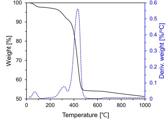 Figure 2 shows the thermogravimetric (TG) and differential thermogravimetric (DTG) curves of the CNTs. Multiple peaks were observed in the graph, indicating that multiple components such as nanotubes, amorphous carbon, and graphitic nanoparticles were present inside the CNTs [33]. The largest weight change occurred between 350 and 500 °C, and the residue content was found to be 50% after 500 °C. During the production of CNTs, the section in which the weight change occurs varies with the production method used and the proportion of raw materials [34,35].