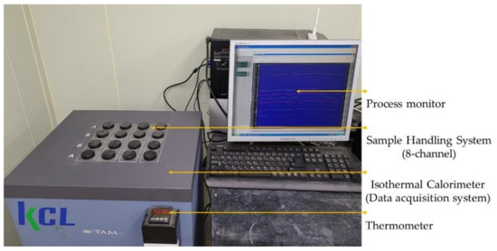 For the CNT paste, the heat flow of hydration and cumulative heat were measured using a TAM Air isothermal calorimeter in the same way as in the experiment conducted by Park and Choi [41]. The TAM Air 8-channel standard volumetric calorimeter operates in the mW range and consists of an 8-channel twin-type calorimeter block and a data acquisition system. After each mixture was homogeneously mixed, approximately 4 g of paste was placed in a 20 mL glass ampoule and the weight was measured. The glass ampoule was installed in a calorimeter maintained at 23 °C and measured for 48 h. Figure 4 shows the TAM Air isothermal calorimeter used in this study.
