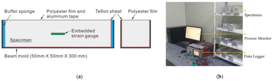 The autogenous shrinkage of CNT-reinforced cement composites was measured using a gauge embedded in the center of the specimen, which was placed in a 50 × 50 × 300 mm beam mold sealed with Teflon and polyester sheets, as shown in Figure 5. Three specimens were used to measure autogenous shrinkage for each variable. This test method was similar to that reported by Kohno et al. [42] and Kim et al. [43]. The PMFL-series embedded strain gauges with a length of 60 mm and a diameter of 4 mm (Tokyo Sokki Kenkyujo Co., Ltd., Japan), showing the applicability in measuring the autogenous shrinkage inside CNT-reinforced cement composites, were pre-located inside the mold in this test. Teflon sheets were used inside the mold to minimize the stress that may occur during the early hardening process. In addition, buffer sponges were installed at both ends of the mold to minimize the restriction of the specimen at both ends. The top surface of the specimen was sealed using aluminum foil tape to prevent moisture evaporation. In this test, autogenous shrinkage was measured while the specimen was placed inside the mold without demolding. Autogenous shrinkage was measured in a constant temperature and humidity chamber at a temperature of 23 ± 2 °C and a relative humidity of 60 ± 10% every 5 min using a data logger. The autogenous shrinkage result was calculated based on the final setting time (See Table 3).