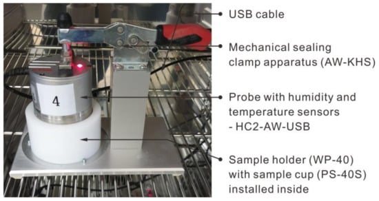 The relative humidity inside the CNT-reinforced cementitious composites was measured using the setup shown in Figure 6. Approximately two-thirds of the disposable cylindrical sample cup (diameter of 45 mm and height of 40 mm) was filled with the specimen to be measured. A temperature humidity probe (HC2-AW-USB, Switzerland, Rotronic AG) was then fixed on top of the sample holder containing the sample cup. These were mechanically fixed by the clamp sealing apparatus during the test to minimize the influence of the surrounding environment. The measured relative humidity was automatically recorded in a connected computer every 5 min. For each mixture, the RH values of the three specimens were measured and the average value was used.