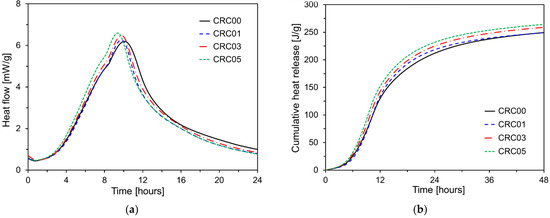 Figure 7 shows the heat flow and cumulative heat releases of CNT-reinforced cement composites. In general, the hydration of OPC is divided into four periods: the initial period, induction period, acceleration period, and retardation period [45]. As shown in Figure 7a, the heat flow was not changed in the induction period regardless of the CNT content. As the CNT content increased, the acceleration period quickened, and the peak increased. In addition, the retardation period also decreased as the CNT content increased. This indicates that the addition of CNTs accelerated the hydration reaction of cementitious materials because the mix proportions except for the CNT content were the same in this study. This result was also reported by other researchers [18,28]. The authors estimated that the CNTs inside the paste accelerated the hydration of OPC because it acted as nucleating agents [18,28]. As the CNT content increased, the hydration reaction of cement accelerated, and the 48-h cumulative heat increased (see Figure 7b). In the case of CRC01, its cumulative heat was higher than that of CRCC00 after 12 h; however, its 48-h cumulative heat was the same as that of CRC00. Therefore, the cumulative heat of CRC00 is likely to be higher than that of CRC01 after 48 h. As the amount of binders and water used in each specimen were the same, it was found that the addition of CNTs can accelerate the hydration reaction; however, the cumulative heat may decrease with the increase in CNT content. Tafesse and Kim [46] investigated the hydration kinetics of CNT-reinforced pastes with a W/C ratio of 0.4. They reported that the 60-h cumulative heat of a specimen with a CNT content of 0.6% compared to the binder was lower than that of a specimen with a CNT content of 0.3%, even though the addition of CNTs accelerated the hydration reaction.