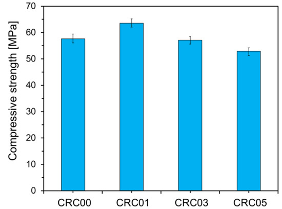 The compressive strength of the CNT paste was measured at 28 days in accordance with ISO 679 [40]. For each mixture in Table 2, three specimens were fabricated using a 40 × 40 × 160 mm metal mold. The paste specimens were cured in a constant temperature and humidity chamber at 20 ± 1 °C and a relative humidity of 90% or higher for 24 h. They were then removed from the mold and cured in a water tank at 20 ± 1 °C until 28 days of age. Each specimen was split into two before measuring the compressive strength. The compressive strengths of six specimens were measured, and the average value was used.