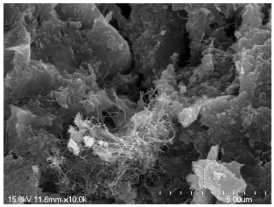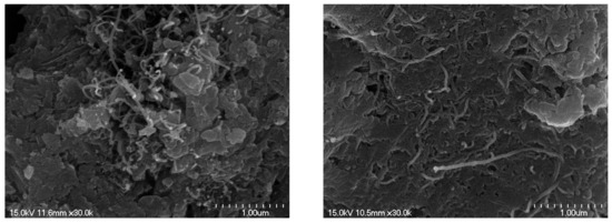 To analyze the morphology of the CNTs and CNT-reinforced cement composites, SEM images were obtained using an ultra-high-resolution cold field-emission SEM (Hitachi SU-8230, Hitachi, Japan). The specimen was crushed into particles of less than 5 mm after the 28-day compressive strength test to observe SEM images of CNT-reinforced cement composites. The crushed samples were dried at 40 °C for 24 h [44].