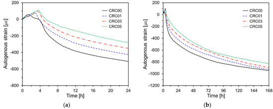 Autogenous shrinkage of CNT-reinforced cement composites: (a) 24 h; (b) 168 h.