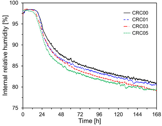 Figure 12 shows the IRH of the CNT-reinforced cement composites. IRH began to decrease after 24 h, and IRH decreased more rapidly as the CNT content increased. For CRC05, IRH decreased after approximately 12 h. The time at which IRH began to decrease was delayed as the CNT content decreased. Figure 7 also shows that hydration was accelerated as the CNT content increased, indicating that the decrease in IRH was also accelerated due to the acceleration of hydration. CRC01 and CRC03 exhibited similar IRH values until 48 h, but the IRH of CRC03 was lower than that of CRC01 after 48 h. The difference in IRH between CRC00 and CRC05 was the largest at 36 h. The difference was maintained from 36 to 144 h, but it decreased after 144 h. This indicates that the addition of CNTs accelerates the water reduction rate inside the pores due to the increase in the initial hydration rate, but its influence decreases after 144 h. The IRH of CRC05 was lower than that of CRC03 until 144 h, but they became identical after 144 h. This indicates that the effect of CNT addition on IRH decreases as age increases. This tendency was also observed in Figure 7. The cumulative heat release of CRC01 was higher than that of CRC00 at early ages, but they became similar at 48 h. The difference in cumulative heat release between CRC05 and CRC03 also increased after four h, but it decreased after 48 h. CRC05 exhibited the highest hydration rate due to the shortest induction period, and it also showed the fastest reduction in IRH.