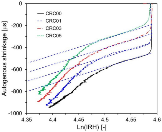 Figure 13 shows the relationship between the autogenous shrinkage and IRH. The graph is divided into two stages. In the first stage, autogenous shrinkage increased with no change in RH, which is referred to as the water-vapor saturated stage. The water-vapor saturated stage was also observed in other studies, and it is affected by the water-to-binder ratio [54,55,56]. In the second stage, the RH decreased. In stage I, the CRC00 sample exhibited the largest autogenous shrinkage, and autogenous shrinkage decreased as the CNT content increased. In stage I, the shrinkage increased due to the change in bulk strain, regardless of the hydration reaction. It appears that the bulk strain decreased as the CNT content increased, owing to the bridge effect of the CNTs. In stage II, the change in autogenous shrinkage was similar regardless of the CNT content. The slope of stage II is affected by the IRH change caused by the hydration reaction. In the graph, the slope of stage II was similar regardless of the CNT content. This indicates that CNTs affected the hydration reaction, but the effect of the hydration reaction on autogenous shrinkage was not significant. Consequently, the reduction in autogenous shrinkage due to the increase in CNT content resulted from the decrease in bulk strain caused by the bridge effect of CNTs.