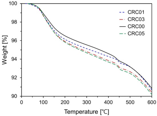 Figure 14 shows TG analysis results. As the CNT content increased, the weight change caused by TG also increased. This appears to be because the addition of CNTs accelerated early age hydration and thereby increased hydrates, as can be seen from Figure 7 and Figure 8. In the graph, the weight began to change after 50 °C, and the weight change increased as the CNT content increased. The decomposition of C-S-H, a main hydrate of cement, occurs between 50 and 200 °C, and it appears that the generation of C-S-H was accelerated. Portlandite, another main hydrate of OPC, decomposes between 400 and 580 °C. As its contents were 13.05, 12.30, 12.00, and 12.11% in CRC00, CRC01, CRC03, and CRC05, respectively, the effect of CNT addition on it was found to be insignificant. Jung et al. [57] also reported that decomposition increased at temperatures below 200 °C as the addition of CNT increased. CNTs accelerate the early age hydration of OPC, but they appear not to have an impact large enough to rapidly increase hydration products.