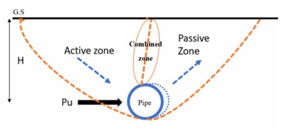 Numerical studies were also performed to examine the pipe–soil interaction during relative movements of the oblique or three-dimensional pipe-soil [14]. The forces imposed on the buried pipe due to lateral soil movement are similar to the geotechnical engineering problems of retaining walls or horizontally loaded piles and the associated lateral earth pressures. Soil resists lateral penetration of objects by mobilizing its passive pressure, which contrasts with earth pressure at rest (K). Figure 1 presents a schematic of the lateral ground movement on the buried pipe.