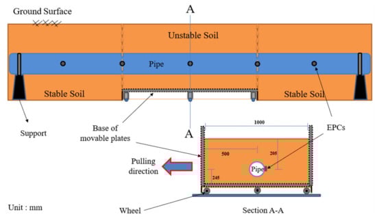 In addition, the EPCs were also connected to the same data logger to record the stress on the buried pipe. The movable plate was pulled out (displacement of 50 mm) using a manual pulley, and the data logger started to record the stress values from the earth pressure sensors. Moving plate displacement increased gradually by 50 mm, from zero to 700 mm, and stress measurements were recorded in real-time at each stage of the movement.