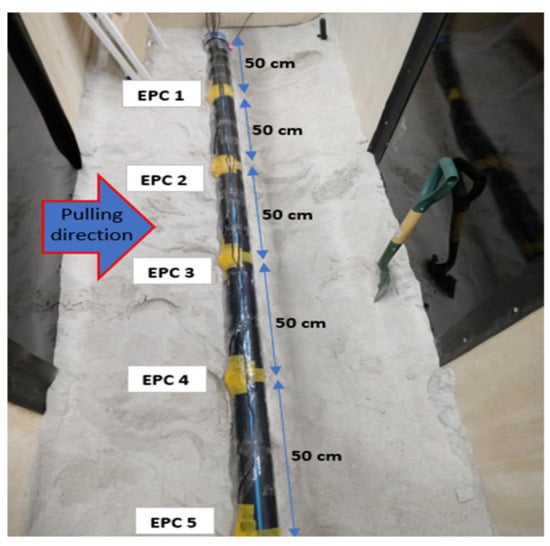 However, physical models of the soil–pipeline relationship are usually carried out by pulling or pushing the pipeline horizontally using wires or rigid shafts in a constant direction [16,17,18,19,20,21,22,23,24,25,26]. Disregarding the pipe’s direction of motion can lead to an overestimation of the loads on the pipe that the soil can bear [19]. Alarifi et al., [27,28] developed a small model to study the behavior of a small diameter of a buried pipe under the landslide effect using strain gauge sensors. They succeeded in running the model by pushing the soil forward to the buried pipe rather than pulling the pipe directly.