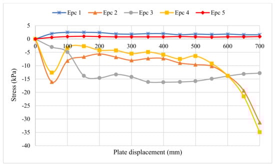 Figure 6a illustrates the behavior of the stresses at the front side of the pipe (EPC 1, 2, 3, 4, and 5) during the initial stages of plate motions that were measured using wire displacement sensors (50 mm, 100 mm, and 150 mm). At 50 mm of plate movement, EPC 2 and EPC 4 (located at the unstable soil boundary) recorded the highest stresses with an average value of −14.35 kPa. The middle section of the pipe (EPC 3) recorded pressure of −3 kPa, whereas in the stable soil zones (EPC 1 and EPC 5) minimum pressures were recorded, i.e., the average pressure was only 1.3 kPa. The negative stress values indicate the active soil pressures at EPC 2, EPC 3, and EPC 4. In contrast, the positive stress values in EPC 1 and EPC 5 indicate that soil pressures on the pipe were in the passive zone. Referring to Figure 5; Figure 6a, the stresses at EPC 2 and EPC 4 started to drop when the displacement of the movable plate had exceeded 50 mm, which indicates the failure of soil at the boundary of the landslide. In contrast, the stress values of EPC 3 began to rise (located at the middle of pipe).