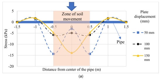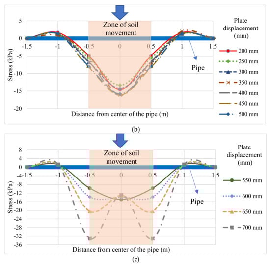 Figure 6b shows stress values at the plate displacement from 200 mm to 500 mm with no significant stress changes. The soil pressure began to increase again in small amounts at the boundary of the landslide. In contrast, at the middle of the pipe, the soil pressures were not constant (increases and decreases in an unregulated manner). At 550 mm of plate movement, the stresses at the boundary of the landslide began to increase because the wall was approaching closer to the pipe (see Figure 6c). In comparison, the pressures in the mid-section began to decrease due to the soil failure in the middle of the landslide area.