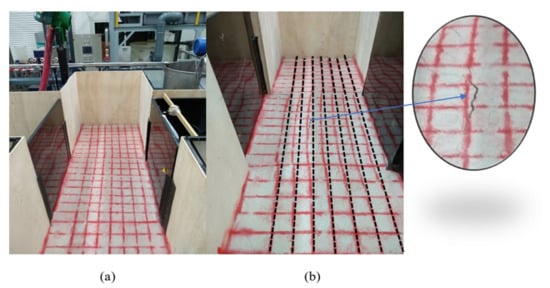 According to the analysis of lateral soil pressure on the pipeline, the section of the buried pipeline located in the landslide area experienced the greatest stress [30]. The lateral pressure increased as soil displacement increased, and soil surface deformations appeared above the pipe position [9]. In this experiment, a camera was mounted next to the model box to monitor the soil surface deformations. The evolution process of soil instability and failure was recorded in real-time by the camera. Figure 7 illustrates the surface displacement of the soil before and after moving the movable plate. Figure 7a displays the soil surface position before starting the experiment, while Figure 7b presents the surface of the soil after displacing the moving plate by 50 mm. The dashed black lines represent the original location of the ground before the displacement.
