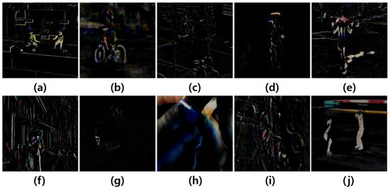 Figure 4a,f, some background regions remain due to the movement of the camera, but the pixel value of a person with major movements can be differentiated from background.