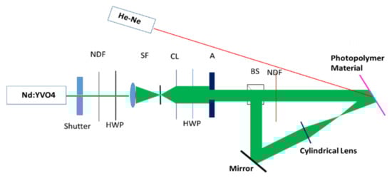 An off-axis holographic lens can be recorded by using the setup shown in Figure 2. Two collimated beams are arranged such that they overlap on the photopolymer layer, then a suitable lens is inserted into one of the beams such that it focuses the beam before it reaches the photopolymer as shown. This produces a diverging beam to interfere with the collimated reference beam and a HOE lens is recorded. The numerical aperture of the lens determines the divergence of the beam and the range of the angles of incidence at the photopolymer. This kind of recording was demonstrated previously with both cylindrical and spherical lenses []. However, in this instance, a cylindrical lens was used so that the beam only diverged in one axis (horizontal). This simplified the modeling and experimental testing since the grating characteristics varied in only one axis. In the blue sensitive photopolymer formulation optimization work, simple gratings were recorded, and the set-up was identical except for the fact that both beams were collimated, as the cylindrical lens was not present. For some characterization work, a 532 nm and a 473 nm laser were used but for recording in the dual-sensitized layer, an argon ion was used so that both the 514 nm and 488 nm laser lines could be used in the same optical setup.
