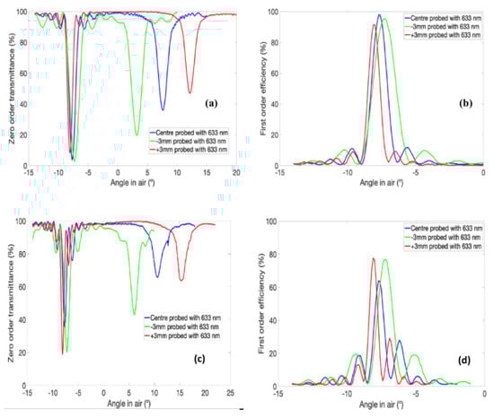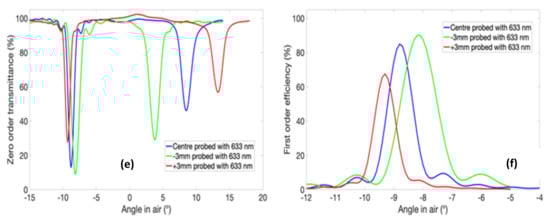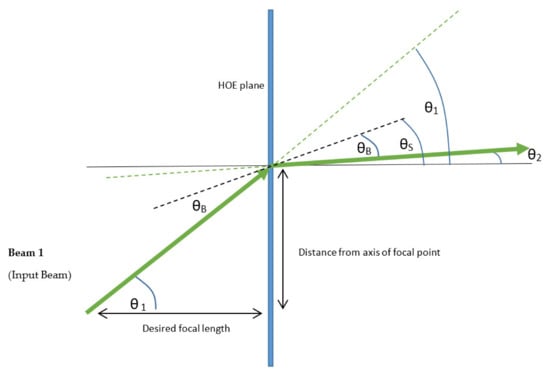 Volume HOEs work on the principle of Bragg’s law [], and at the Bragg condition, the angle of incidence equals the angle of diffraction (. Equation (2) defines the wavelength at the Bragg condition.