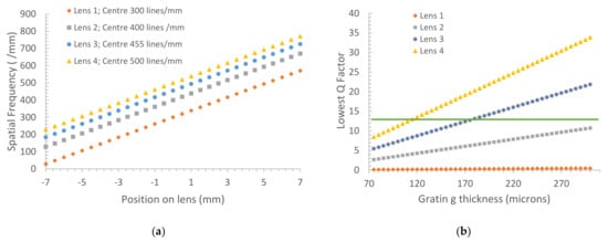 First, the range of spatial frequencies expected to be recorded across the lens for a recording wavelength of 514 nm was calculated for a number of different off-axis angles (different central spatial frequencies). The calculated range of spatial frequencies for lenses having central spatial frequencies of 300, 400, 455 and 500 L/mm are shown in Figure 5a. Figure 5b shows the calculated Q values for the lowest spatial frequency occurring in each lens from Figure 5a for different thicknesses. It was decided to choose the lens with the lowest off-axis angle (and spatial frequency range) that would ensure volume Bragg grating behavior (Q > 10) across the whole lens aperture for 150 microns in thickness. This ensures that higher orders are negligible. A minimum of 140–150 micron-thick gratings were shown to be needed to avoid crosstalk in previous work []; thickness above 150 microns can be more challenging to prepare without compromising layer optical quality. The lens chosen was, therefore, Lens 3, with 150 μm layer thickness and 455 L/mm central spatial frequency.