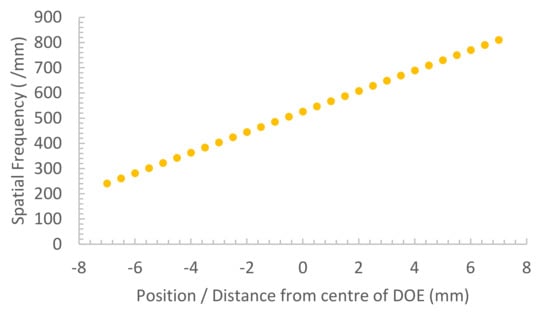The next step was to design a second lens, which would produce the same output angle across the whole lens aperture for a 488 nm design wavelength with the same range of input and output angles. The Q value for the lowest spatial frequency was 11.4, for a 150 micron layer, ensuring volume diffraction here, too. Since 150 micron layers were used, the capability of achieving sufficient grating strength was assured for the green sensitive formulation (100% can, in fact, be achieved in much thinner layers []). Figure 6 shows the range of spatial frequencies across this lens, which has the same angular offset and focal length as Lens 3 but is designed for operation at λ = 488 nm.