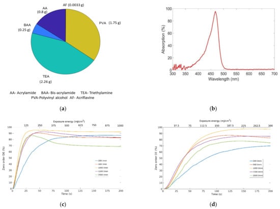 In the literature, acriflavine sensitized photopolymer material was used in the development of a panchromatic photopolymer for holographic recording applications []. Previously, the characterization of a 60 μm thick transmission grating with high spatial frequencies was reported []. In this work, a similar composition is optimized for the range of spatial frequencies polymer layer thickness needed in this application. Figure 7a shows the composition of the layers and Figure 7b, the absorption spectrum for this acriflavine-sensitized photopolymer.