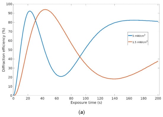 The refractive index modulation needed to maximize the diffraction efficiency was controlled through exposure during recording, as detailed in the experimental section. Some characterization was needed in order to achieve this for the blue-sensitive formulation, which had not been as widely studied as the standard green (eythrosine B) formulation.