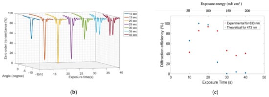 For 500 L/mm, individual gratings were recorded at a constant intensity (5 mW/cm2) but with different exposure times. The recording time for each gratin g was increased from 10 to 40 s with an interval of 5 s. Figure 8b shows the results obtained in the form of zero-order Bragg selectivity curves, when the individual gratings were probed after recording by a He–Ne laser. Each curve graphs a set of data obtained by rotating the probe beam though a range of angles while monitoring the diffraction efficiency. The curves are arranged in Figure 8b according to the exposure time used to create the grating. They show gratings of increasing strength up to the optimum exposure and then the characteristic indications of overmodulation (growing sidelobes). The minimum value from each zero-order Bragg selectivity was taken to obtain the growth curve, which is shown in Figure 8c, along with theoretical values for the efficiency, which is for the same strength grating at 488 nm (using Equation (3)). Considering the growth of diffraction efficiency for both 200 L/mm and 500 L/mm spatial frequencies, the optimized time to record gratings with 5 mW/cm2 for λ = 488 nm is estimated ≈16–20 s. As seen in Figure 6, the holographic lens to be recorded covers the range of spatial frequencies from 198 L/mm to 790 L/mm.