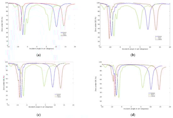 Zero-order transmission angular selectivity curves when the stacked lens is probed by a He–Ne laser at three positions. (a), (b), (c) and (d) show the results for samples (1), (2), (3) and (4) respectively.
