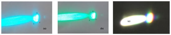Demonstration of the stacked lens producing a collimated beam when illuminated with a cylindrically expanding laser beam at (a) 488 nm and (b) 514 nm and (c) with a white LED passing through a cylindrical lens.