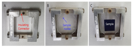 The steps in the alignment process are carried out as follows. First, an electrical isolation (insulating) gap (connector) is inserted between the two aluminum bars of the alignment jig (Figure 3A). Second, a sample holder is connected to the alignment jig (Figure 3B), Third, a sample is placed on the sample holder (Figure 3C). Finally, an electric field is applied between the nozzle tip and the collecting plate. The fibers ejected from the nozzle tip are aligned from the left alignment bar to the right alignment bar. Then, the electrospun fibers are annealed at 120 °C for 10 min. The number of electrospun fibers was increased as the electrospinning time increased.