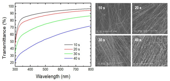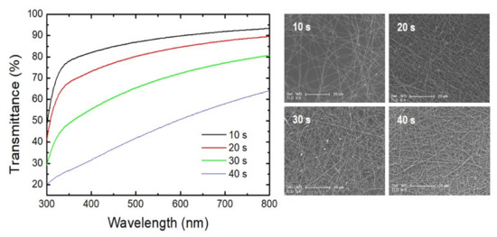 Figure 5 shows the optical transmittance of the aligned fibers. The transmittance of the randomly distributed fibers was measured at 550 nm. The measured transmittances were 93.2% at a deposition time of 10 s, 89.2% at 20 s, 78.0% at 30 s, and 57.6% at 40 s. The transmittance of the bare glass substrate was 9.3%. As the density of PS fibers increased, the transparency decreased because of increased light scattering [22]. The transmittance decreased as the film thickness increased due to increasing reflection.