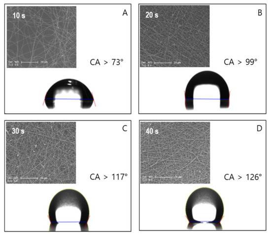 Figure 6A–D show the WCAs of the random networks of electrospun PS fibers spun with deposition times of 10 s, 20 s, 30 s, and 40 s. The WCAs of the as-spun fibers depended on the duration of electrospinning. The WCA increased from 73° to 126° as the electrospinning time increased. Details of WCA measurement conditions and results are summarized in Tables S1 and S2 (Supplementary Materials). The scanning electron microscope (SEM) images of aligned electrospun fibers showed a rough and three-dimensional distribution as seen in Figure S1. However, the SEM images of the randomly distributed fibers showed a flat and two-dimensional distribution (Figure S2). Szewczyk et al., found that the water contact angle of electrospun fiber meshes increased as the surface roughness increased, while surface roughness increased as the electrospinning time increased. Surface roughness is the key parameter in the analysis of WCAs on electrospun meshes [23].