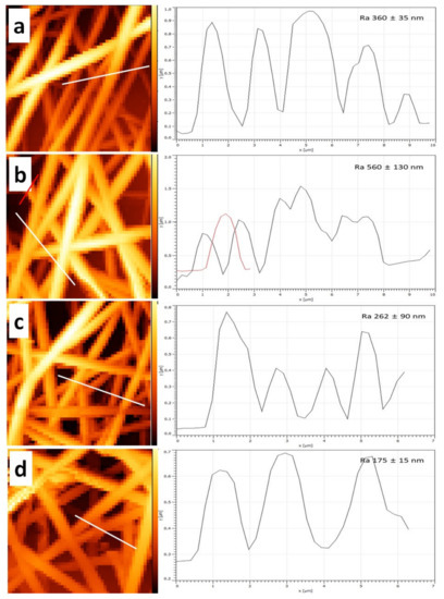 The nanofibers’ topography was further identified by AFM workshop’s atomic force microscopes (Hilton head island, USA) with intermittent tapping of a 10 μm × 10 μm area with the back-side of an aluminum-coated rectangular cantilever. The acquired topography AFM images were then subjected to post-analysis of surface roughness. Within the 10 μm × 10 μm area, we measured five points to obtain the root-mean-square (Rq, RMS) roughness.