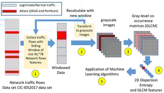 The rationales for the approach proposed in this paper are following: the first reason is related to the choice of using the GLCM beyond the need for dimensionality reduction as explained above. The idea is that the sequential structure of the network flows, in case of an intrusion, is altered in comparison to the legitimate traffic. Since the GLCM is created by calculating how often pairs of pixels with a specific value and offset occur in the image, the underlying idea of the approach is that numbers of pairs of pixels will be altered when an attack is implemented. Such changes will be reflected in the frequencies of the number of pairs, which (in turn) will have an impact on GLCM features (e.g., contrast) or information theory measures like entropy. The second reason for the proposed approach is that the classical Shannon entropy measure is only based on the histogram of GLCM elements while it would also be valuable to evaluate the sequences of GLCM elements since they may provide further information on the presence of the attack. For this reason, the 2D Dispersion Entropy (2DDE) was introduced in the study. As described in Section 3.4 later in this paper, 2DDE allows to analyze irregularity of images on the basis of the frequency of patterns in the image, which can provide more information than the classical Shannon entropy.
