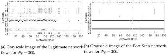- The sliding window data (of size 78) is converted to gray images by rescaling the values of the network flows features. The rescaling is implemented by converting the original values of the network flows in the sliding window to the range 0–256 (for each network flow feature) to obtain 256 levels of gray. A linear conversion is used. Examples of the resulting gray images for the Legitimate traffic and the Port Scan traffic are shown in Figure 2, where the y-axis represents the id of the network flow feature, while the x-axis represents the flow id. The sliding window is applied in sequential order regardless of the IP origin as it was created in the public data set [5] used in this paper.