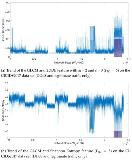 Apart from the application of the ML algorithms, the difference of the discriminating power of 2DDE in comparison to the other features to detect an attack can be visualized by the trends of the features in comparison to the network flows features. Figure 5a,b show respectively the trend of GLCM-2DDE and GLCM-Entropy (i.e., Shannon Entropy) for the Port Scan attack. The blue plot shows the trend of the specific feature while the bar graph (purple bars superimposed on the plot) identifies the windows where the attack is implemented and labelled. It can be seen in Figure 5a that the values of GLCM-2DDE (called simply 2DDE in the rest of this paper) are notably higher in correspondence to the Port Scan attack than the normal legitimate traffic. This difference is less evident for the GLCM-Entropy feature. These differences in values are the reason why the performance of GLCM-2DDE is higher than the GLCM-Entropy when ML is applied.