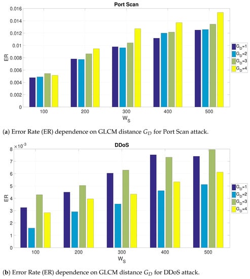 An evaluation of the use of all the GLCM angles was also implemented to validate the adoption of only a limited set of GLCM angles as described in Section 3.3. The results are provided in Table 6 using the Decision Tree algorithm. The results in Table 6 show that a subset of the GLCM angles (as selected in this study) provides a better performance than using all angles since the ERs for the subset are smaller than the ERs for all the GLCM angles. The results are consistent for different values of and for both attacks of PortScan and DDoS.