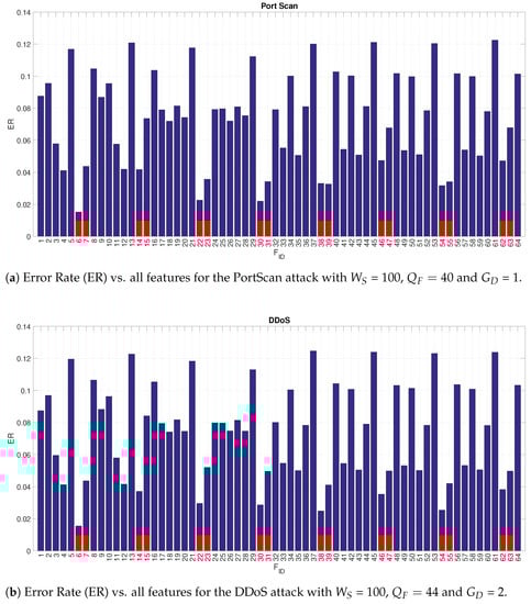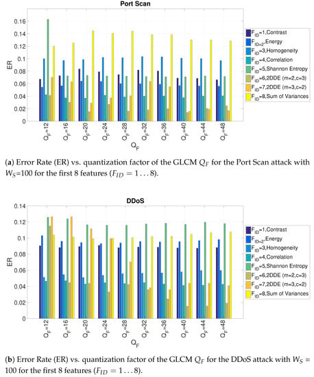 Figure 7 shows only the first 8 features. Then, a more extensive analysis of the detection performance of each of the 64 features was carried on by setting the optimal value of the other hyperparameters (, and ). The results are shown in Figure 8a,b where the ER is reported for each feature identified with the identifier. To better visualize the features related to 2DDE a red bar is used in the Figures. Figure 8a,b show that the 2DDE is able to obtain a consistent high detection accuracy in comparison to the other features for all the 64 features. In particular, for both attacks, the values of m = 2 and c = 3 in the 2DDE definition provides a better performance than the values of m = 3 and c = 2 in the 2DDE definition. This result shows the higher detection performance of 2DDE in comparison to the other features (e.g., Shannon entropy or variance). The results shown in these figures also give an indication on the GLCM angle, which is most performing. In general, the GLCM distance and angle defined by the 2-tuple [0 ] (which corresponds to ) provides better results (in terms of detection accuracy) than the other 2-tuples.