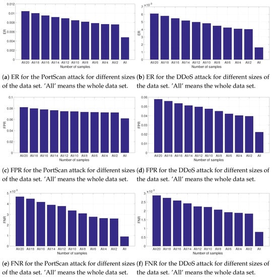 ER, FPR and FNR for the PortScan and DDoS attack for different sizes of the whole data set.