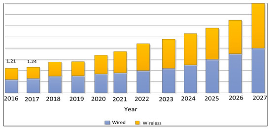 Surveillance systems have become more and more popular in recent times. Government and private organizations, residential societies, and commercial and public spaces, are using these systems to keep a check on various activities for security and safety purposes. In French, the word “sur” means “from above” and “veiller” means “to watch”. Surveillance means monitoring movements, activities and behavior in order to manage, control, and protect people. Surveillance systems have the advantage of remote and continuous monitoring. To view events as they occur and to monitor activities in any area at a later time, closed-circuit television systems (CCTV) technology is being used. Increasing thefts and criminal activities demand the usage of CCTV cameras in both commercial and residential sectors for security purposes. CCTV cameras are available in different forms: non-IP (Internet Protocol), IP CCTV cameras and wireless CCTV cameras. Due to the features of technology, flexibility, ease of use, and affordability, the usage of IP-based wireless CCTV cameras is becoming a trend in the present scenario. As it is being used in many applications all over the world, the market for CCTV is widely expanding. Figure 1 shows the forecast of the wired and wireless cameras market in the coming years. The size of the security camera market was valued at USD 3.71 billion in 2019 and is expected to grow at a compound annual growth rate (CAGR) of 15.7% from 2020 to 2027 [1].