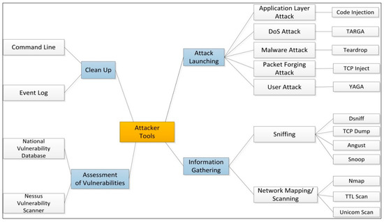 In an attack scenario, the basic steps are: (a) information gathering, (b) assessing vulnerability, (c) launching attack, and (d) cleaning up. Some of the tools used by attackers at different steps are listed in Figure 4. Hoque et al. [24] present more elaborate details of information gathering and attack launching tools that can be used by attackers. M.Rytel et al. [25] presents details of different vulnerability databases available, attack surfaces and their details.